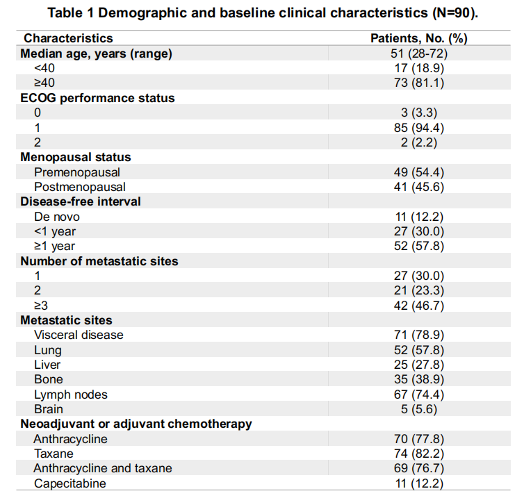 共纳入90例患者。中位年龄为51岁;46.7%的患者有三个或更多转移部位;78.9%的患者有内脏转移;82.2%的患者有既往紫杉烷类药物暴露史。