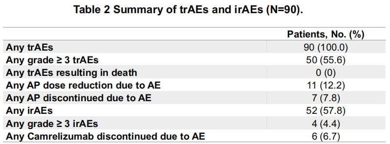 所有患者均报告了治疗相关不良事件(TRAEs),其中3-4级TRAEs发生率为55.6%,包括中性粒细胞减少(34.4%)、白细胞减少(24.4%)和贫血(10.0%)。免疫相关不良事件(irAEs)发生率为57.8%,包括反应性皮肤毛细血管增生症(RCCEP,45.5%)、皮疹(11.1%)和肺炎(10.0%)。3-4级irAEs仅发生在4.4%的患者中。