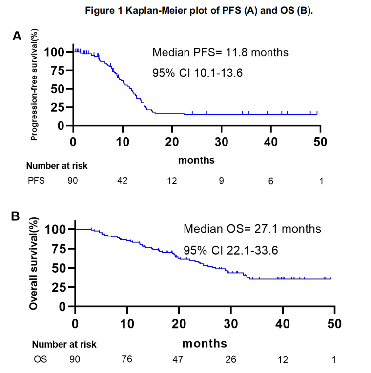 至数据截止日期(2024年7月10日),中位随访时间为18.1个月。中位PFS为11.8个月(95%CI:10.1~13.6),中位OS为27.1个月(95%CI:22.1~33.6)。ORR为71.1%,DCR为86.7%。中位至缓解时间为1.5个月。
