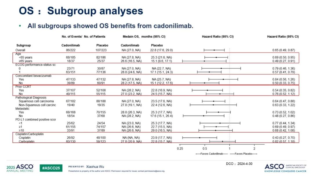 2025 ASCO发布的亚组分析展现出与整体人群一致的生存获益。然而,在预先设定的接受过同步放化疗、未接受过贝伐珠单抗治疗以及年龄≥65岁的患者亚组中,该方案显示出更显著的获益。