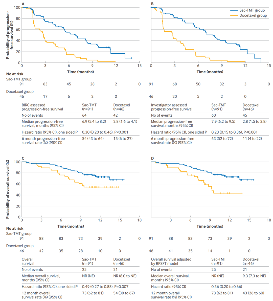 芦康沙妥珠单抗组和多西他赛组的12个月OS率分别为73%和54%(HR 0.49,95%CI:0.27~0.88;单侧P=0.007)。在调整交叉治疗后,sac-TMT同样显示出OS改善(HR 0.36,95%CI:0.20~0.66)。