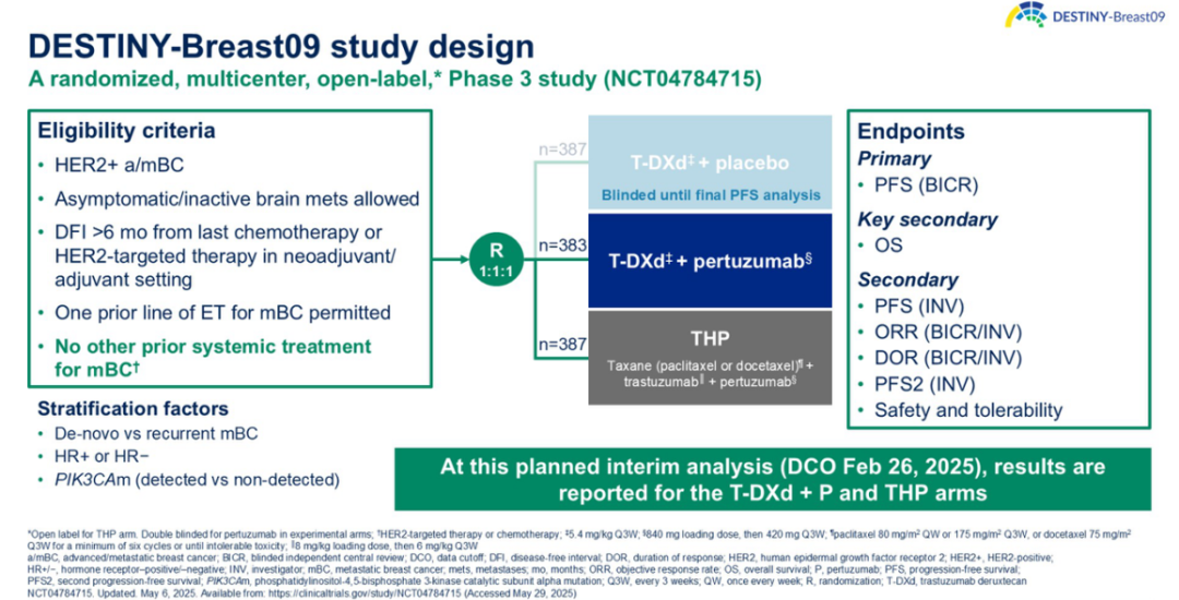 DB-09研究将符合条件的HER2阳性晚期乳腺癌患者按1:1:1的比例随机分配至三个队列,分别接受T-DXd+安慰剂、T-DXd+帕妥珠单抗(T-DXd+P)或曲妥珠单抗+帕妥珠单抗+多西他赛(THP)治疗。