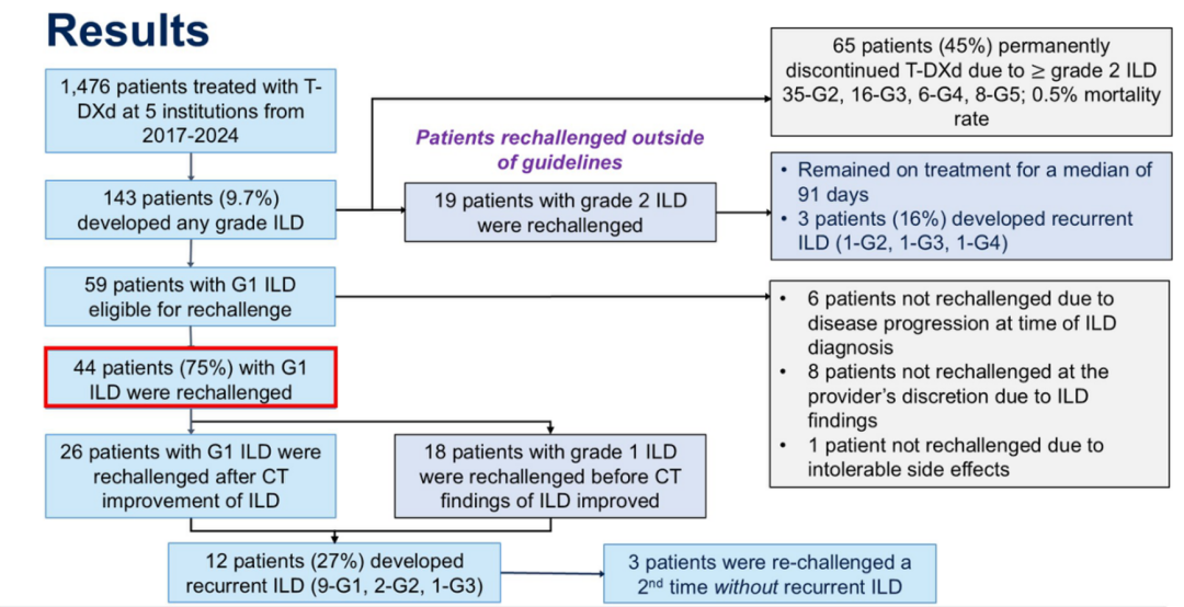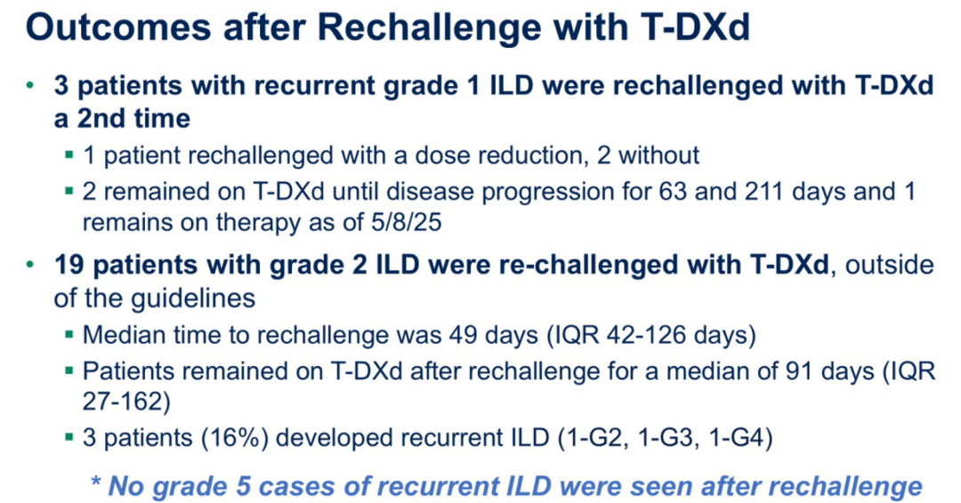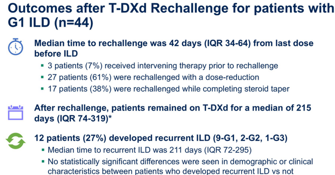 在这项真实世界研究中,还有19例患者出现2级ILD后,再次使用T-DXd进行治疗,ILD复发率相似。因此,对于不同患者,我们需要更好地评估其从T-DXd治疗中的获益率,以及肺损伤与基础疾病之间的关系,从而对使用T-DXd的患者进行更有效的管理。