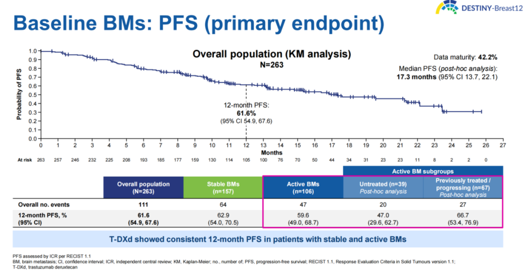 以T-DXd为代表的新型ADC药物也显示出了较好的治疗疗效,从DB-01、02、03针对HER2阳性脑转移患者的汇总分析,到去年ESMO大会上公布的DB-12的研究数据,均显示T-DXd在HER2阳性脑转移患者的良好治疗效果。DB-12研究入组了既往经1线或多线抗HER2方案治疗患者,263名患者基线有脑转移,241名患者基线没有脑转移。研究结果显示,基线有脑转移患者其中位PFS可达17.3个月,总体客观缓解率(ORR)可达71.7%。研究结果还提示,T-DXd无论对于稳定性脑转移还是活动性脑转移患者均有良好治疗效果。综上所述,对于部分脑转移症状不严重、不急于进行局部处理的患者,优先进行全身治疗已成为公认的治疗策略。