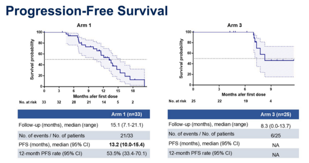 截至2024年12月31日,研究结果显示:Arm 1组确认的颅内ORR为84.4%(27/32);Arm 3组颅内ORR为72.7%(16/22)。两组的颅内ORR与总ORR疗效相似,所有患者颅内疾病控制效果较好。Arm 1组中位无进展生存期(PFS)为13.2个月(95%CI:10.0-15.4),Arm 3组的PFS尚未成熟。
