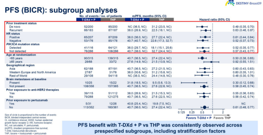 目前,T-DXd单药组的数据尚未披露。根据研究设计,需待研究全部结束后才会公布。但无论如何,我们已经看到了T-DXd+P在晚期HER2阳性乳腺癌患者一线治疗中的疗效。BICR评估的亚组分析结果显示,PFS获益在所有亚组中均保持一致。在该研究中,部分患者存在PIK3CA突变,部分患者曾在新辅助治疗中使用过靶向治疗。由此可见,该研究入组人群与CLEOPATRA、PHILA研究入组人群存在差异,更符合当前真实世界治疗情况,为我们的临床治疗提供了较好的参考。