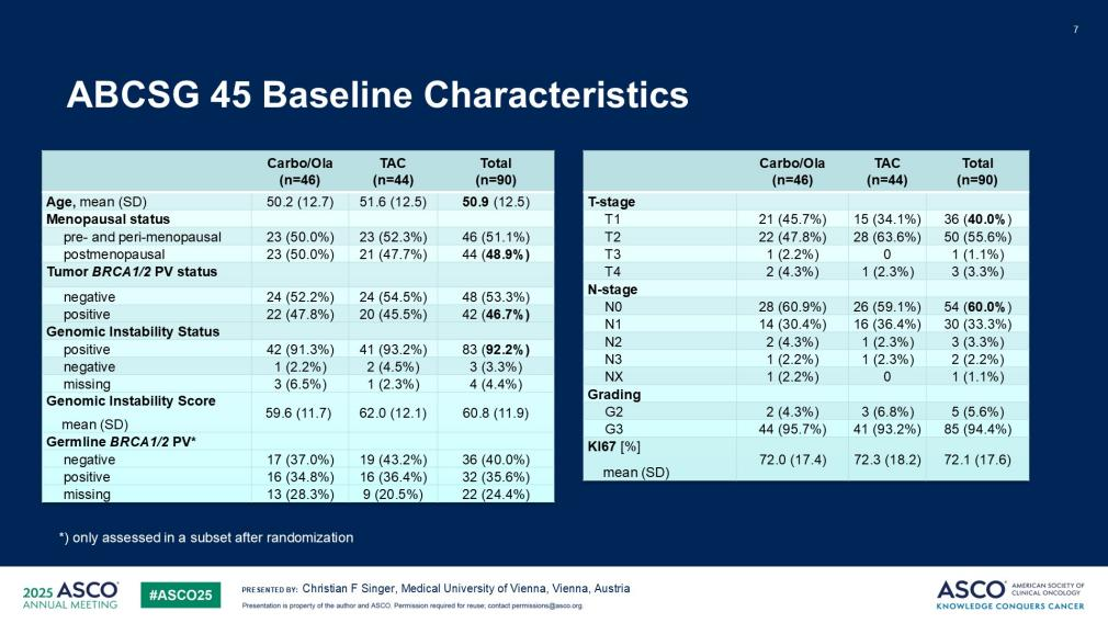 [3]Christian F.Singer,et al.Prospective randomized phase II trial to assess the efficacy and safety of neo-adjuvant olaparib/carboplatin(OC)in comparison to docetaxel/epirubicin/cyclophosphamide(TAC)in patients with early triple-negative breast cancer(TNBC)with homologous recombination deficiency(HRD):Primary results from the ABCSG 45 trial.ASCO 2025;Abstract#510