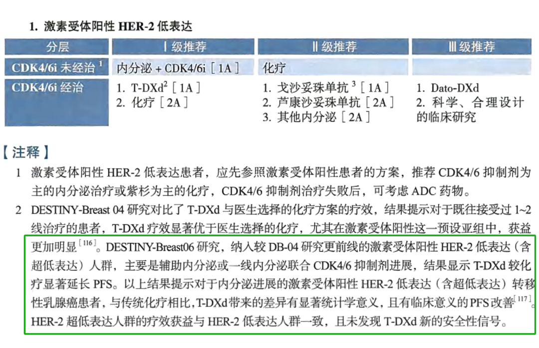总体上,NCCN、ESMO指南对于CDK4/6i+ET经治患者,推荐基于gBRCAm、ESR1m、PAM通路变异、HER2表达状态等选择相应的精准治疗策略。在已报道的post-CDK4/6i相关III期临床试验中,单药PARP抑制剂或PAM通路抑制剂的中位PFS约为6.7~7.8个月,单药新型SERD约为3.8~5.8个月,而新型HER2 ADC已经超越1年[6]。在2025年第一次更新的NCCN乳腺癌指南中,以及2025年4月更新的ESMO MBC在线指南中:均将T-DXd的应用范围从以往的HER2低表达(IHC+,或IHC 2+且FISH-)扩大至HER2超低表达(轻度膜染色的IHC 0);并且将治疗线序提前至未接受过化疗的患者;此外,对于有内脏危象的HER2低或超低表达患者可接受T-DXd一线解救治疗。这些更新主要基于DESTINY-Breast06(DB-06)研究的报道,针对ET失败且未接受过化疗的HR+/HER2低或超低表达患者,T-DXd可相较于化疗显著改善全体患者的PFS(13.2 vs 8.1个月,HR 0.62,95%CI:0.52~0.75,P<0.001),且HER2低表达(HR 0.62)和超低表达(HR 0.78)患者显示了一致的PFS获益[7]