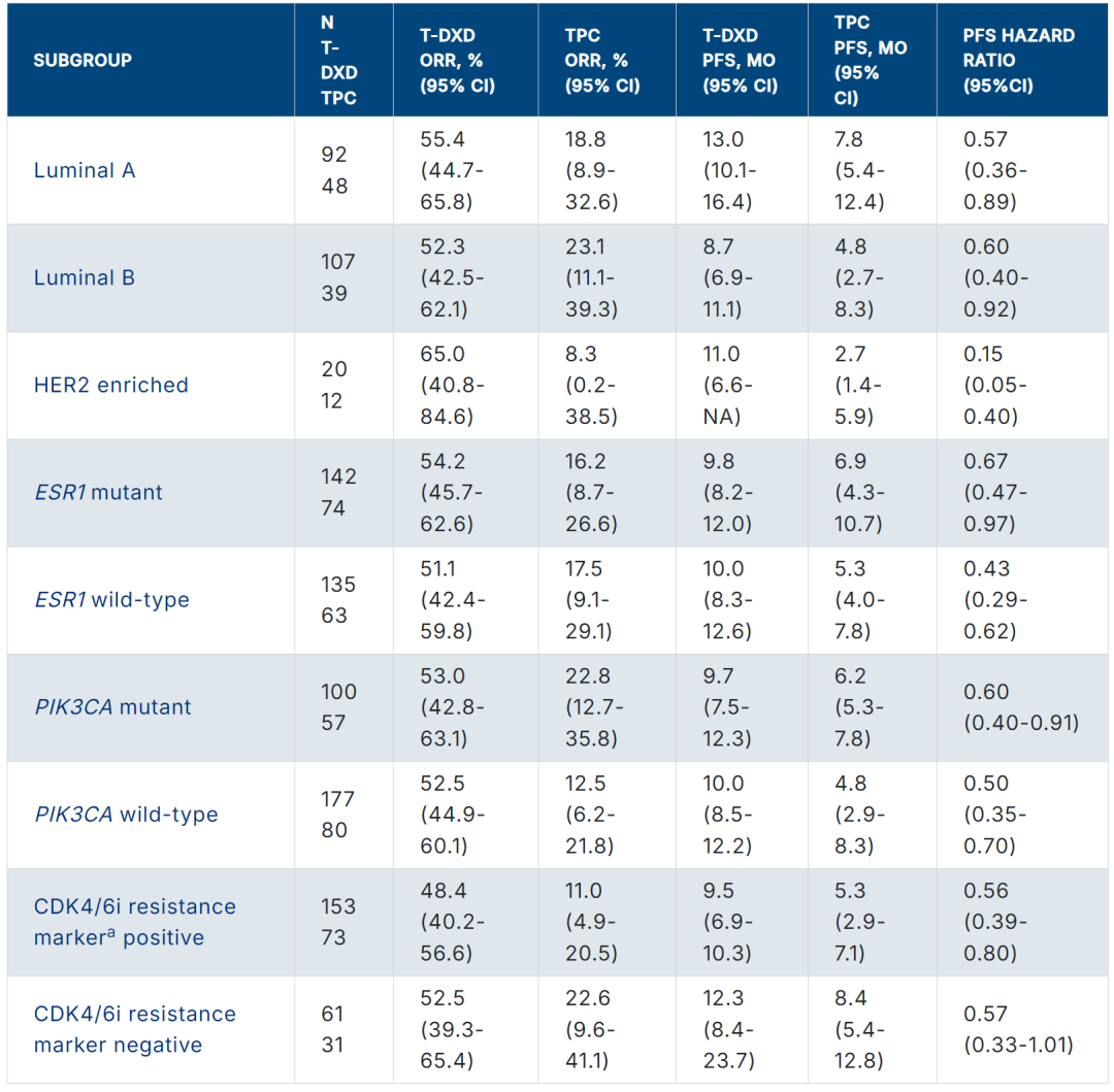 2023年ASCO大会曾报道DB-04的探索性分析,结果显示在HER2低表达患者中,无论内在亚型如何、Luminal A型或B型,以及是否存在ESR1、PIK3CA突变和CDK4/6i耐药标志物,T-DXd均显示了一致的ORR和PFS获益(表1)[11]
