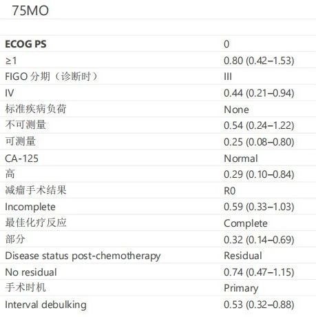☆亚组分析揭示了特定患者群体中的显著获益:获益最明显的是具有可测量病灶的患者(HR=0.25;95%CI:0.08-0.80)以及CA-125水平升高的患者(HR=0.29;95%CI:0.10-0.84)。化疗后有残留病灶的患者(HR=0.38;95%CI:0.19-0.79)以及接受间歇性肿瘤细胞减灭术的患者(HR=0.53;95%CI:0.32-0.88)也获得了显著获益。