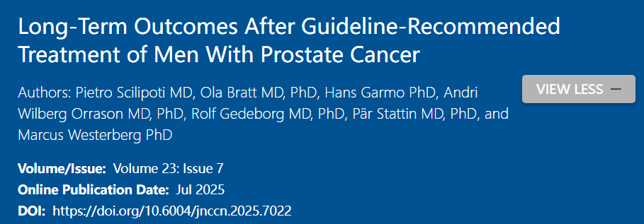 Scilipoti P,Bratt O,Garmo H,et al.Long-Term Outcomes After Guideline-Recommended Treatment of Men With Prostate Cancer[J].Journal of the National Comprehensive Cancer Network,2025,23(7).