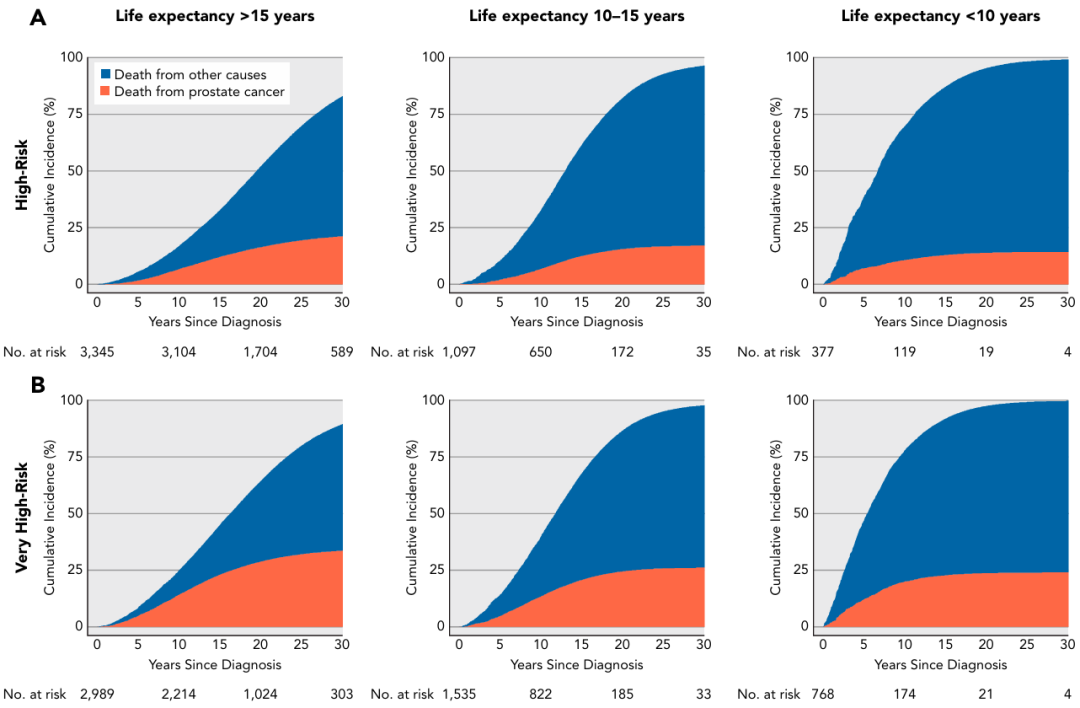 在每个风险类别中,前列腺癌死亡率和其他原因死亡率均随预期寿命而变化。例如,对于低危患者,15年前列腺癌死亡率为2.5%~10%,而对于预期寿命>15年和<10年的男性,其他原因导致的死亡率变化范围为20%~81%。