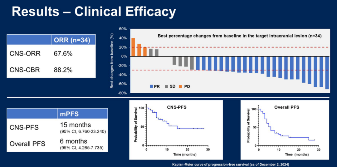 优替德隆具有高血脑屏障透过性,可在脑组织中维持有效药物浓度;贝伐珠单抗通过促进血管正常化,降低血管通透性,减少肿瘤相关水肿及渗出,从而缓解脑转移临床症状。三药联合方案(优替德隆+依托泊苷+贝伐珠单抗)在HER2阴性乳腺癌脑转移患者中展现出显著疗效。截至2024年12月2日(中位随访时间11.5个月),中枢神经系统客观缓解率(CNS-ORR)达67.6%,中枢神经系统临床获益率(CNS-CBR)达88.2%,中枢神经系统无进展生存期(CNS-PFS)达15个月,结果一经公布便引发了国际同行的广泛关注。