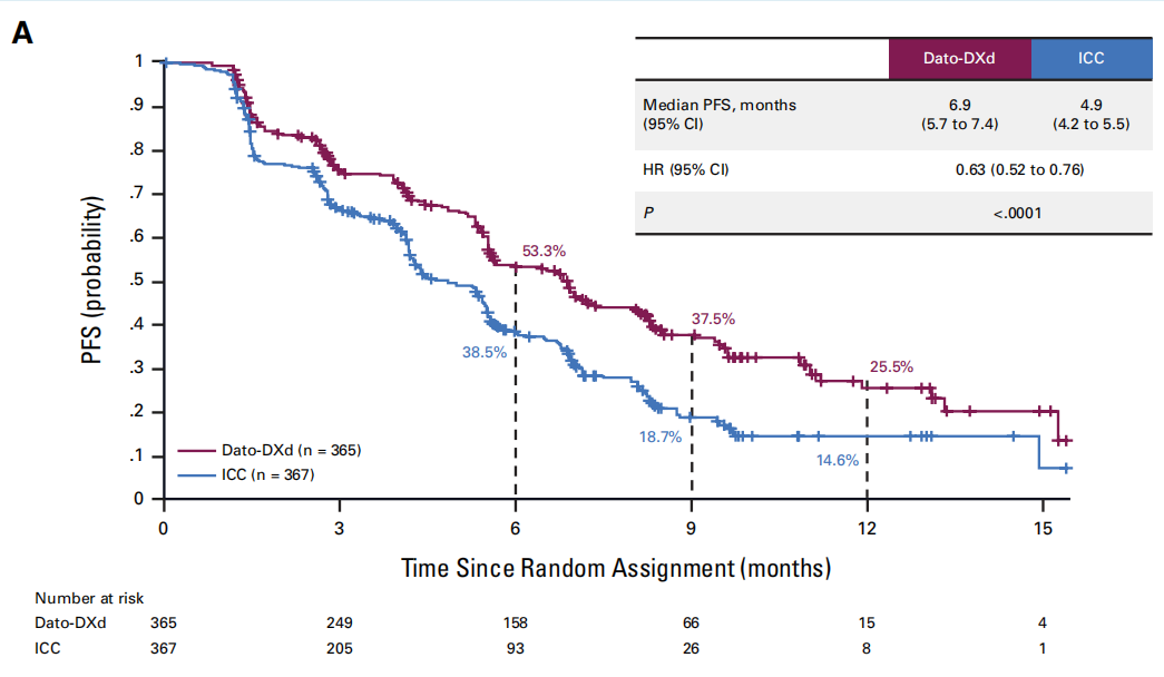 最终Dato-DXd组365例、ICC组入组367例患者纳入分析,其中超80%的患者既往接受过CDK4/6抑制剂治疗。研究结果显示,主要研究终点方面,Dato-DXd组mPFS较化疗组延长2个月(6.9个月vs 4.9个月),疾病进展风险降低37%(HR,0.63[95%CI:0.52~0.76];P<0.0001)。OS方面也具有一定的获益趋势(HR,0.84[95%CI,0.62~1.14])。
