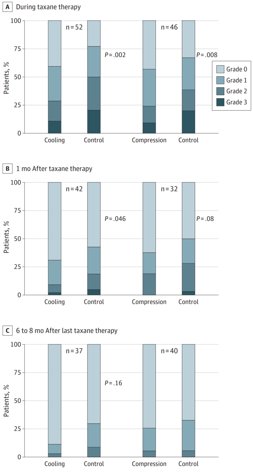 3月6日,《JAMA Oncology》在线发表了手部低温疗法和加压疗法预防紫杉类相关周围神经病变的前瞻性、随机、自我对照、单中心POLAR研究[6]。该研究纳入122例首次化疗的乳腺癌患者,在予以含紫杉醇或白蛋白紫杉醇周疗方案新辅助或辅助治疗后,按1:1分组后分别予以低温疗法或加压疗法,另一只手不干预作为对照组。结果显示,两种干预措施均能显著降低化疗相关外周神经毒性(CIPN)的发生率,其中低温疗法将高级别CIPN的风险降低了42%,压迫疗法降低了37%,两种疗法之间未见显著差异。在治疗期间、治疗1个月后干预组均显示了显著的优势(图2)。此外,研究还评估了患者的生活质量、指甲毒性以及长期随访中的疗效,结果显示低温疗法在可能表现更为突出,而压迫疗法则具有更好的耐受性。