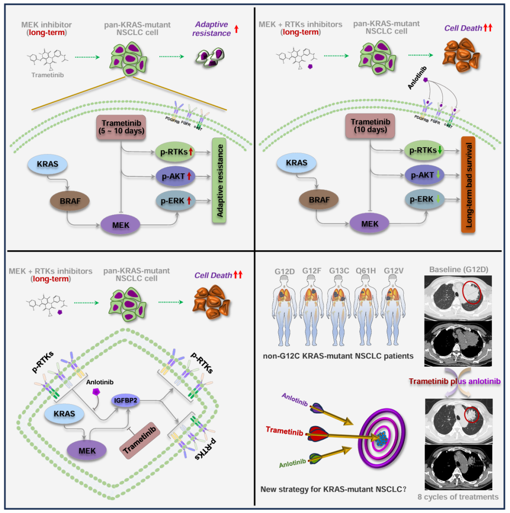 该研究由上海交通大学医学院附属胸科医院韩宝惠教授、钟华教授团队与西湖大学(原中国科学院分子细胞科学卓越创新中心)季红斌教授团队合作完成,首次通过I期临床实试验证实:MEK抑制剂曲美替尼联合泛RTK抑制剂安罗替尼可高效抑制non-G12C KRAS突变型NSCLC进展,临床疗效显著且安全性可控,有望改写该分子分型的肺癌全球治疗格局。