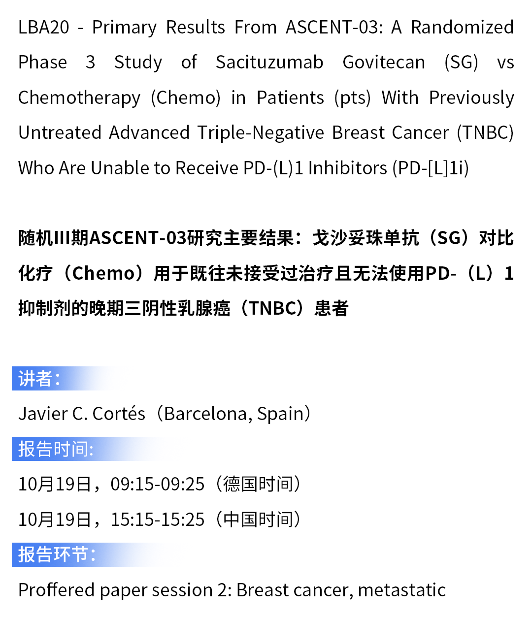 [14]Javier C.Cortés,et al.Primary Results From ASCENT-03:A Randomized Phase 3 Study of Sacituzumab Govitecan(SG)vs Chemotherapy(Chemo)in Patients(pts)With Previously Untreated Advanced Triple-Negative Breast Cancer(TNBC)Who Are Unable to Receive PD-(L)1 Inhibitors(PD-[L]1i).ESMO 2025;LBA20