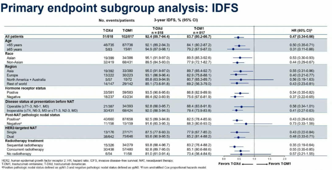 此次公布的研究期中分析结果显示:T-DXd组的三年IDFS率为92.4%(95%CI:89.7–94.4),而T-DM1组为83.7%(95%CI:80.2–86.7),T-DXd较T-DM1治疗,可使患者浸润性疾病复发或死亡(对应IDFS)风险显著下降53%(HR 0.47,95%CI 0.34-0.66,P<0.0001);同时,IDFS获益在所有预设亚组中均保持一致,且T-DXd组局部和远处复发均更少出现。