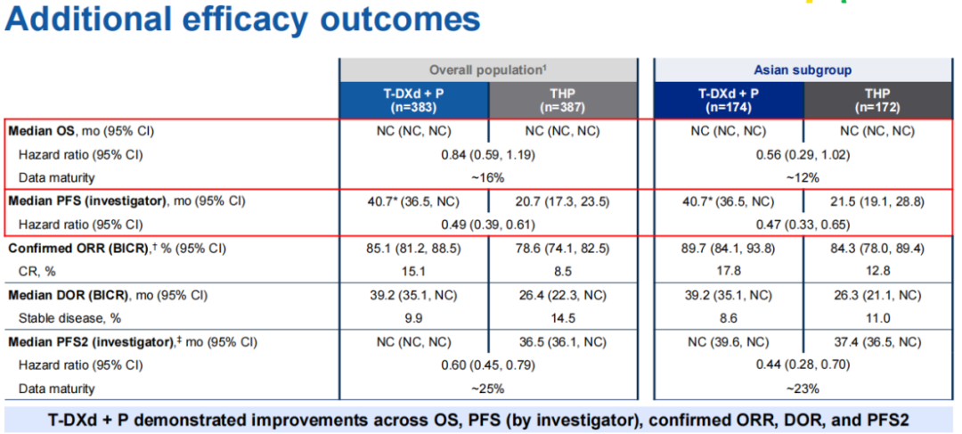 值得注意的是,DB-09研究入组患者近1/4来自中国,此前在2025中国临床肿瘤学会(CSCO)学术年会上,也公布了纳入179例患者(T-DXd+P组88例,THP组91例)的中国人群分析结果:T-DXd+P组由BICR评估的mPFS尚未达到,但HR值为0.51,较亚洲人群数据更低,且ORR/CR率分别高达95.5%和21.6%,较亚洲人群及全球人群分析数据更高,显示T-DXd+P方案对中国患者治疗获益显著,且获益趋势与研究亚洲人群及全球人群保持一致。