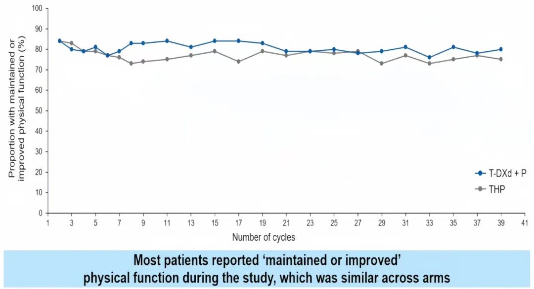 同时,多数患者在起始治疗后报告身体功能得到维持或改善,且两组维持或改善患者占比相似。因此综合以上PROs数据,在T-DXd暴露时长远超紫杉类化疗的前提下,接受T-DXd+P方案治疗患者仍可在长期用药期间,保持较为稳定且与THP组相当的生活质量,进一步充分支持了T-DXd+P方案的良好治疗获益风险比;上述结论也与既往DB-03研究已报告的PROs分析结果相似[4],提示T-DXd用于一线治疗更长期用药时,仍可保持良好耐受性。