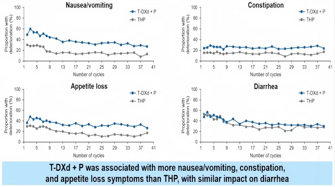 此外,两组患者报告的至疼痛恶化中位时间均未达到,且差异无统计学显著性;T-DXd+P组的疲乏、腹泻症状报告情况与THP组相似,手臂症状/皮肤黏膜症状报告则较少,恶心/呕吐、便秘、食欲减退症状报告稍多,但符合T-DXd治疗已知安全谱,且在研究随访过程中,上述症状相关的PROs数据保持稳定,提示联合治疗未出现毒性叠加,为长期用药奠定基础