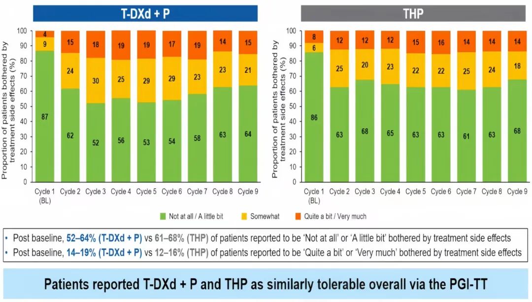 PGI-TT量表评分显示,尽管T-DXd+P组患者的T-DXd中位治疗时长为20.0个月,远超THP组患者接受紫杉类治疗的时长(使用多西他赛患者为5.5个月,紫杉醇患者为4.4个月),但无论是在治疗起始阶段还是在长期治疗后,T-DXd+P组和THP组对治疗的耐受性总体均相似,报告不受治疗困扰或轻微困扰的患者,或受明显/严重困扰的患者比例接近。