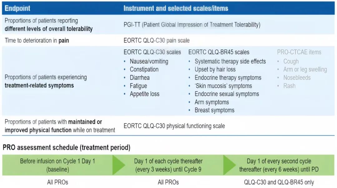 在同期召开的SABCS大会上,被预设为DB-09研究次要疗效终点的PROs分析结果,也入选汇聚高影响力摘要口头报告的“Rapid Fire”专场(摘要号:RF6-07)进行报告[3]。研究以患者治疗耐受性总体印象量表(PGI-TT)分级评估患者对治疗的耐受性,并采用EORTC QLQ-C30量表评估患者的疼痛程度、身体功能和恶心/呕吐、腹泻等常见不良反应,以EORTC QLQ-BR45量表评估治疗总体不良反应、“皮肤黏膜”症状等其它症状和患者所受影响。