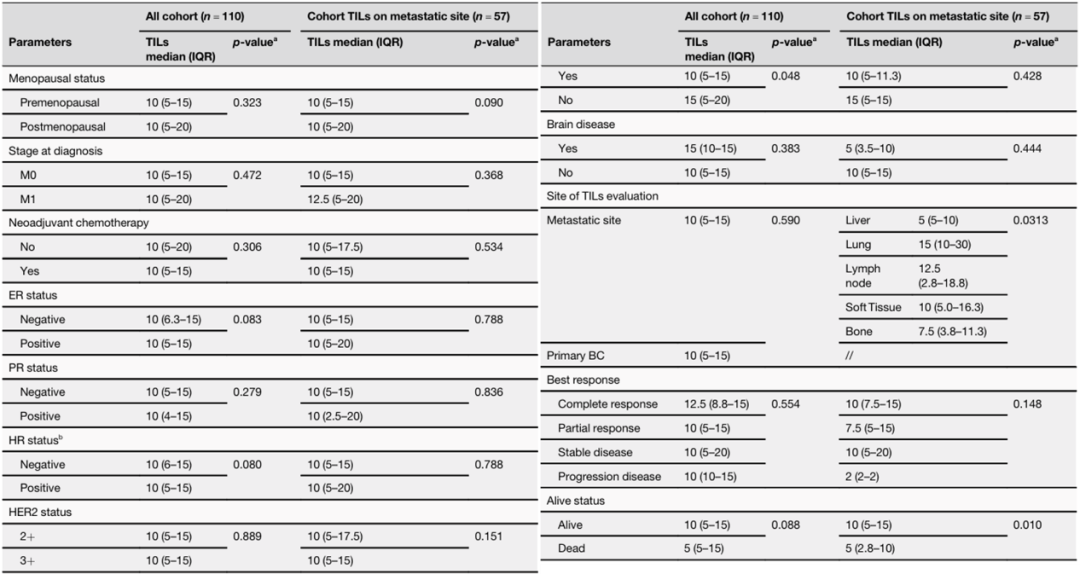 所有110个样本均可评估TIL水平。其中57个样本来自转移灶,53个样本来自原发灶。TIL表达的中位数为10%。同时,评估了TIL作为连续变量与患者临床病理特征之间的相关性。