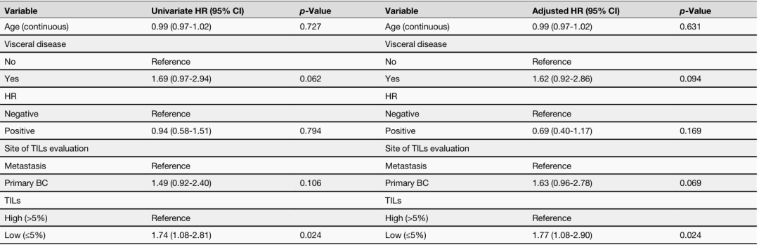 研究者检验了TIL水平与PFS之间的相关性,并校正了年龄、累及内脏、HR状态和TIL评估部位等临床变量。单变量分析显示,TIL水平较低与PFS较差相关(HR=1.74,P=0.024)。校正上述临床变量后,这种关联仍然显著(HR=1.77,P=0.024)。当将TIL视为连续变量(每10%增量)时,TIL水平较高与更好的预后相关,但统计学上并不显著。