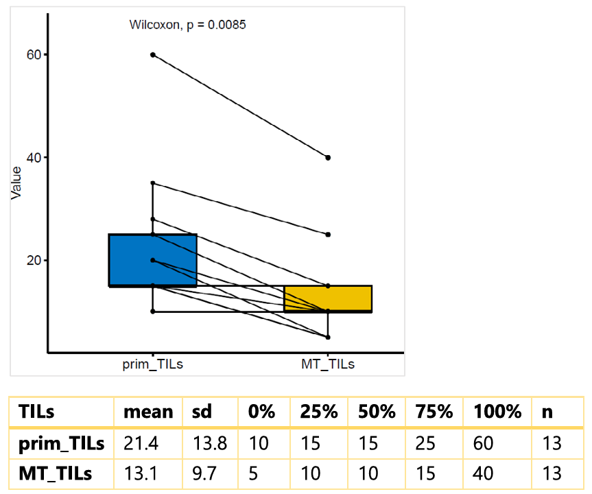 对于一小部分患者(n=13),研究者评估了原发灶和转移灶的TIL水平。结果显示,转移灶中的TIL比例(中位数:10%)显著低于原发灶中的TIL比例(中位数:15%)(P=0.008)。