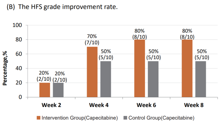 该研究于2024年10月-2025年6月共纳入了40名患者,EGFR抑制剂和卡培他滨治疗相关皮肤不良反应各20例,按1:1的比例随机分配至干预组和对照组,两种措施均每日使用两次,持续8周,干预的时间足以支撑疗效评价。在基线、第2、4、6、8周予以评估,评估指标包括临床医生评估的皮疹和手足综合征(HFS)分级改善情况,患者报告的皮肤不适感(VAS评分)和皮肤病生活质量指数(DLQI)。