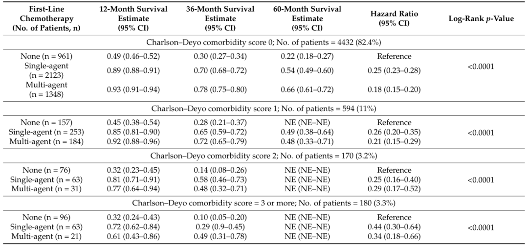 与未接受化疗的患者相比,接受单药一线化疗(HR 0.25)或多药一线化疗(HR 0.18)患者OS率更高。在亚组分析中,所有Charlson–Deyo合并症评分组中,一线化疗患者的OS改善均保持一致。