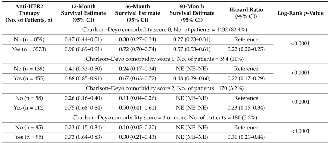 同样,接受抗HER2治疗的女性的OS率(HR 0.22)高于未接受治疗的女性。在亚组分析中,所有Charlson-Deyo合并症评分组中,抗HER2治疗的OS改善均保持一致。