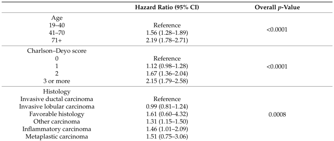 化生癌(HR 2.39)和其他癌症(HR 1.99)的总生存率显著低于浸润性导管癌。然而,与浸润性导管癌相比,浸润性小叶癌(HR 1.11)、良性组织学(HR 0.87)和炎性癌(HR 1.17)的OS率相似。关于HER2 IHC表达,2+和FISH+(HR 1.22)女性的OS率低于3+女性。ER阳性(HR 0.73)和PR阳性(HR 0.72)的OS率高于ER阴性和PR阴性。