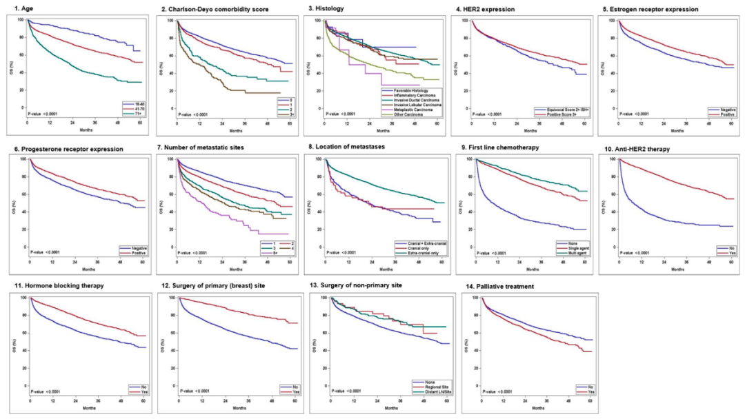 (1-年龄,2-Charlson-Deyo合并症评分,3-组织学,4-HER2表达,5-雌激素受体表达,6-孕激素受体表达,7-转移部位数量,8-转移位置,9-一线化疗,10-抗HER2治疗,11-激素阻断治疗,12-原发(乳腺)部位手术,13-非原发部位手术,14-姑息治疗。)