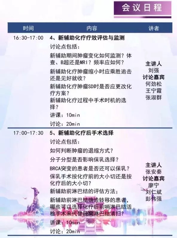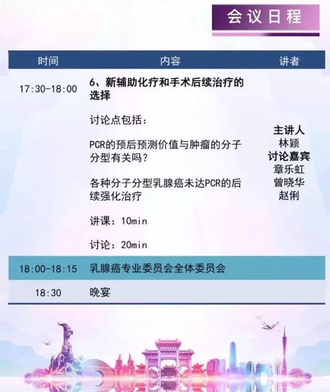 上午还有一个名家讲堂,由邵志敏教授来给大家做新辅助化疗的共识与争议的主题演讲,更进一步对新辅助这个内容进行了总结的发言。会上还有好几位名家做了非常精彩的发言,后面的环节是一个非常接地气的环节,关于乳腺癌病人化疗方案个体化的选择。我们分别针对HER2阳性与HER2阴性乳腺癌进行了主题演讲和充分讨论。对于每一个病人,每个医生会有方案优劣的比较和选择,但不是所有医生都会给病人选择一致的方案。这个环节所讨论的是每个医生给病人选择化疗方案的时候,有哪些考虑点,为什么A方案胜过B方案,我觉得这样的交流是非常好的。此外,当天下午还有一个圣安东尼奥的最新的会议快递,也是圣安东尼奥以及乳腺癌全年各个治疗领域的总结,这是本次会议的内容。