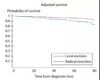 结果显示,两组的基线资料并无统计学差异,但接受根治性切除术的患者肿瘤体积稍大,分期和分级较高;接受局部切除的患者的阳性边缘率稍高(8.23% vs. 0%,P=0.04)。两组均无30天内死亡病例。根治性切除的患者住院时间中位数高于局部切除组(0 vs. 3 d, P<0.01)。 经过调整的Cox比例风险模型显示,两组患者的生存率无显著差异(HR=2.39,95% CI 0.85-6.70,P=0.10,见图1)。局部切除组及根治性切除组的总生存率分别为94.2%及87.2%,二者之间的差异无统计学意义(P=0.08)。无论是切缘阳性(P=0.95),或是淋巴结阳性(p=0.92),均不是死亡率的有效预测指标。只有年龄的增长有可能是死亡率的预测指标(p<0.001)。