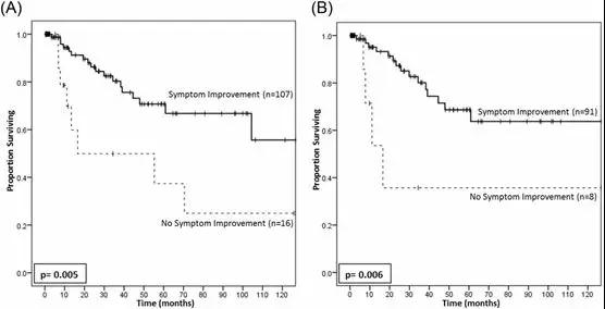 图2、在所有人群(A)及R0切除患者(B)中,症状改善患者均显示出了生存获益