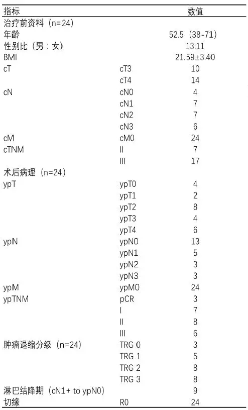 结果:24例患者基线资料:中位年龄52.5岁,最小年龄38岁,最大年龄71岁;男女比例13:11;体重指数21.59±3.40。24例患者治疗前临床分期(cTNM)资料:临床Ⅱ期7例,临床Ⅲ期17例。其中cT3期10例,cT4期14例;cN0期4例,cN1期7例,cN2期7例,cN3期6例;所有患者均无远处转移。24例患者术后病理(ypTNM)资料:病理完全缓解3例,病理Ⅰ期7例,病理Ⅱ期8例,病理Ⅲ期6例。其中ypT0期4例,ypT1期2例,ypT2期8例,ypT3期4例,ypT4期6例;ypN0期13例,ypN1期5例,ypN2期3例,ypN3期3例。肿瘤退缩分级:TRG0级3例,TRG1级5例,TRG2级8例,TRG3级8例(表1)。肿瘤退缩有效率66.7%(表2,图1,图2)。9例患者实现淋巴结降期,降期比率37.5%。