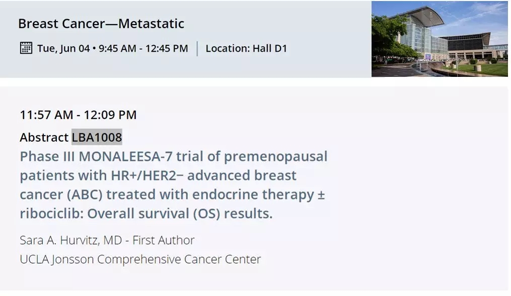无论是RWS,还是人群扩展的Ⅲ期RCT,都将如众星拱月般地迎接在6月4日当天方才公布的MONALEESA-7研究(摘要号:LBA1008),这是本届ASCO大会上乳腺癌领域令人期待的late breaking abstract,加州大学洛杉矶分校Jonsson综合癌症中心的Sara A. Hurvitz教授将在大会上作口头报告,进一步报告MONALEESA-7研究的OS结果。