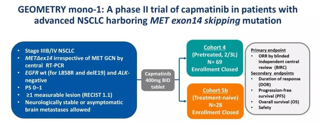 Capmatinib(INC280)是一种高效、高选择性MET 抑制剂。GEOMETRY mono-1是一项II期、多队列、多中心研究,评价Capmatinib对晚期MET14外显子跳跃突变或MET扩增NSCLC的疗效,研究共包括6个队列。入组患者均为IIIB/IV期NSCLC,经中心实验室RT-PCR确认为MET 14外显子跳跃突变(不考虑MET扩增状态/基因拷贝数),EGFR野生型及ALK 阴性,PS评分 0~1,具有≥1个可测量病灶。经治患者为4组,初治患者为5b组,接受Capmatinib片剂400 mg BID治疗。主要研究终点是盲法独立评审委员会(BIRC)依据RECIST v1.1评价的ORR,关键终点指标还包括BIRC判定的DOR、PFS、OS及安全性。