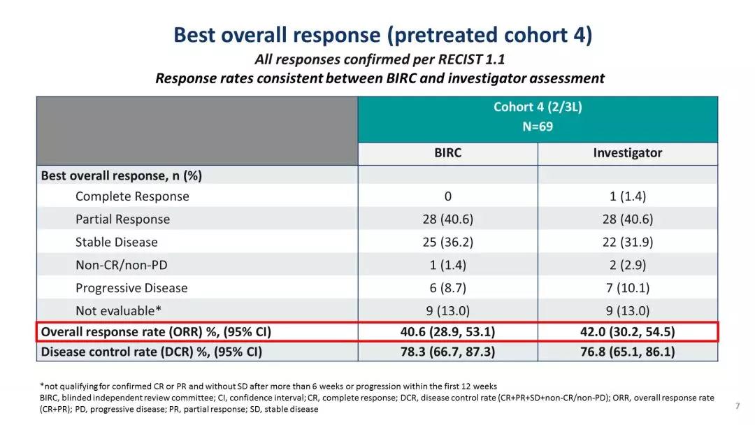 截至2019年4月15日,研究共纳入97例MET 14外显子跳跃突变NSCLC患者(队列4:69例,队列5b:28例)。BIRC评价ORR 队列4为40.6% (28.9-53.1),队列5b为67.9% (47.6-84.1)。DOR:队列4为9.72月(5.55~12.98),队列5b为11.14月(5.55~NE)。中位PFS:队列4为5.42 (4.17~6.97) 月,队列5b为9.69月(5.52~13.86)。安全性数据保持良好。最常见不良反应包括四肢水肿(41.6%)、恶心(33.2%)和呕吐(18.9%)等,大多数不良事件为1~2级。