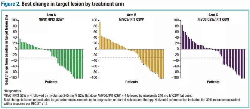 CheckMate 040研究设计共包含6个队列。此次在ASCO大会上发布的是队列4研究结果。其探索性地评估了三种纳武利尤单抗和伊匹木单抗联合给药方案在索拉非尼经治患者中的安全性和有效性[1]。