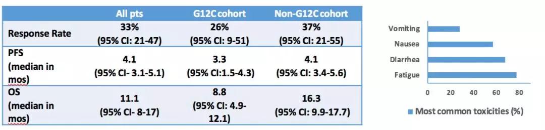 曲美替尼是一种MEK抑制剂,MEK是RAS和RAF的下游信号转导蛋白,因此曲美替尼对KRAS突变肺癌可能有效。这项研究探索了曲美替尼联合多西他赛治疗KRAS阳性NSCLC在不同基因突变亚型中的疗效。研究纳入了54例患者,其中70%既往接受过2线治疗,其中19例为G12C突变,9例G12D突变,9例G12A突变,结果显示:联合治疗ORR为33%,中位PFS为4.1个月,中位OS为11.1个月。各突变亚组分析中,KRAS G12C突变患者的疗效较非KRAS G12C突变相对较差(ORR:26% vs. 37%;PFS:3.3 vs.4.1个月;OS:8.8 vs.16.3个月),但未达统计学差异,这同我们以往看到的数据报道一致。最常见的不良反应为疲劳(78%),腹泻(68%),恶心(57%)和呕吐(28%)。一例患者死于治疗相关的呼吸衰竭。