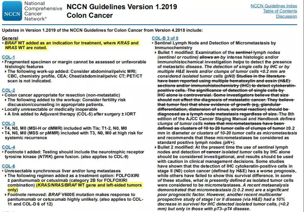 图1. NCCN结肠癌指南更新要点(2019.V1)