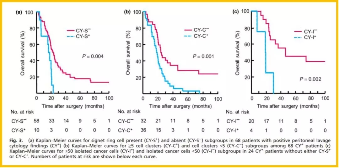 结果显示,患者特征分析和多变量分析表明腹腔灌洗液检测当发现下列三种预测因子时提示预后较差:≥1个印戒细胞,≥5个细胞集群,≥50孤立的肿瘤细胞(图6)[6]。
