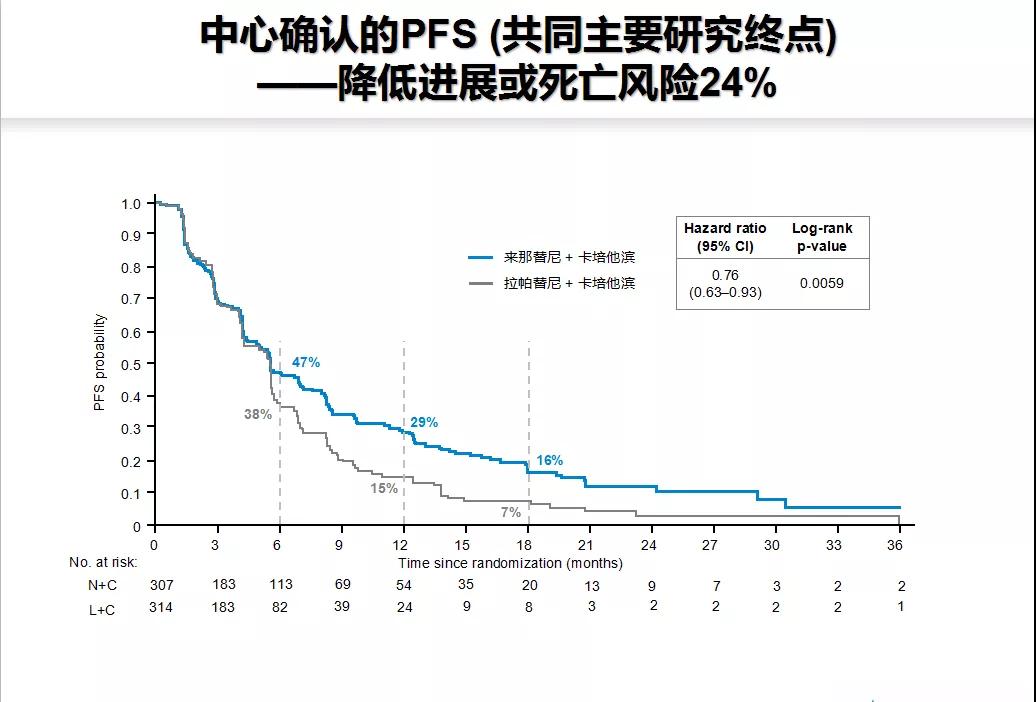 结果发现,总人群来那替尼组疾病进展或死亡的风险较拉帕替尼组降低了24%(HR=0.76, p=0.006),PFS取得了2.2个月的绝对获益(HR=0.76; p=0.0059)。此外,ORR(33%vs 27%);CBR(45%vs 36%);DoR(8.5 vs 5.6个月)均有改善,CNS转移的干预有所减少(22.8% vs 29.2%, p=0.043)。