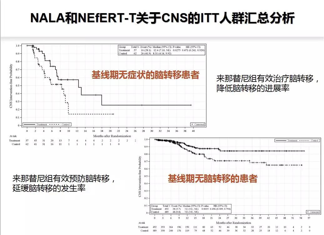 从中枢神经系统脑转移来看,对于基线无脑转移的患者,来那替尼组可以有效预防脑转移,延缓脑转移的发生率;对于基线无症状的脑转移患者,来那替尼组能较好的治疗脑转移,降低脑转移的进展率。