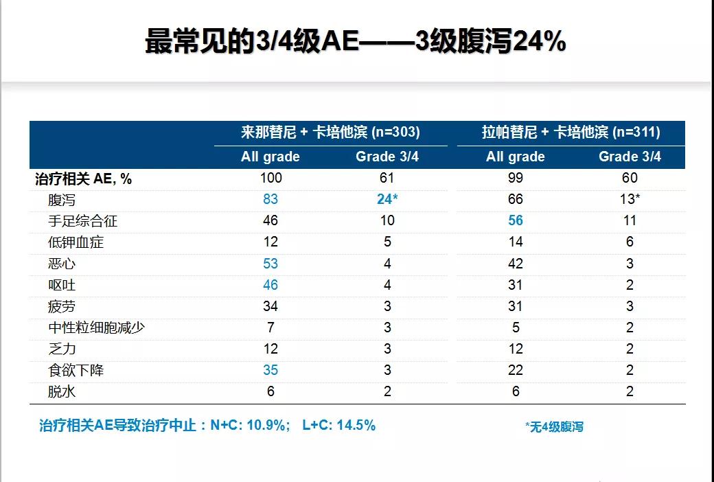 两组患者在接受治疗过程中最主要的不良反应为腹泻,但未观察到新的安全性事件。来那替尼组2.6%的患者因腹泻导致治疗中止,3级腹泻中位累积持续时间为4天,两组患者治疗相关不良事件导致治疗中止的发生率分别为10.9%和14.5%,通过进一步分析患者报告结果得出并未影响患者生活质量。