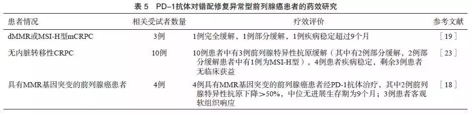 既往研究认为,免疫检查点抑制剂在前列腺癌或CRPC患者中疗效不佳。PD-1抗体帕博利珠单抗已于2017年5月获得美国FDA批准用于不可切除或转移性dMMR或MSI-H型实体瘤治疗。多项研究中纳入的有限数量的dMMR/MSI-H型前列腺癌患者均显示对帕博利珠单抗有较高的敏感性(表5)。《NCCN指南》推荐局部进展、转移性及mCRPC患者进行MSI-H及dMMR检测,如确诊为MSI-H或dMMR型,mCRPC患者可在特定治疗阶段考虑帕博利珠单抗治疗(2B类),同时需要进行遗传咨询及考虑林奇综合征(Lynch syndrome)的相关基因检测,进一步的MMR基因胚系变异检测可以明确其遗传性改变规律。考虑到先行免疫组织化学或MSI再根据结果决定行胚系变异检测的时间比较久,对于符合阿姆斯特丹标准或中国人林奇综合征家系标准(详见《遗传性结直肠癌临床诊治和家系管理中国专家共识》)、且有意愿将胚系变异的检测前置的前列腺癌患者可以考虑直接进行胚系变异检测 。